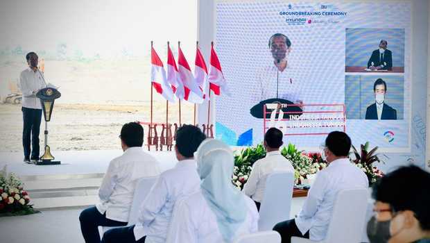 Dalam kesempatan tersebut, Jokowi meletakkan batu pertama pembangunan industri baterai Tanah Air bersama konsorsium Hyundai dan LG.