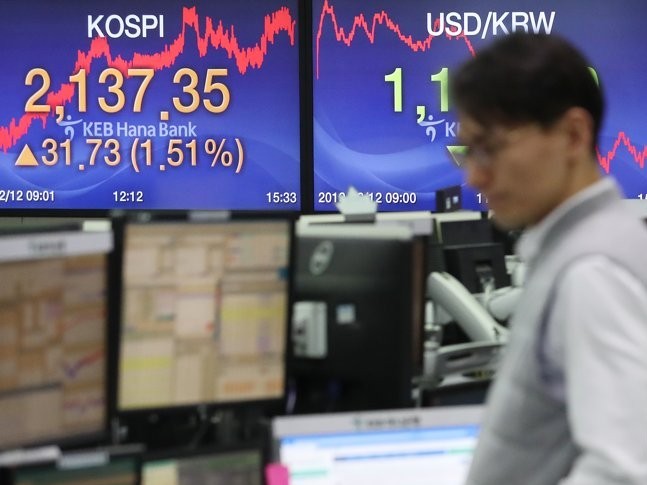 Indeks Kospi di Bursa Efek Korea, Seoul, Korea Selatan,...